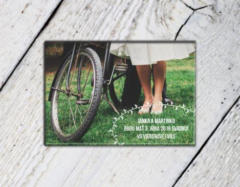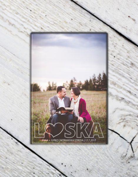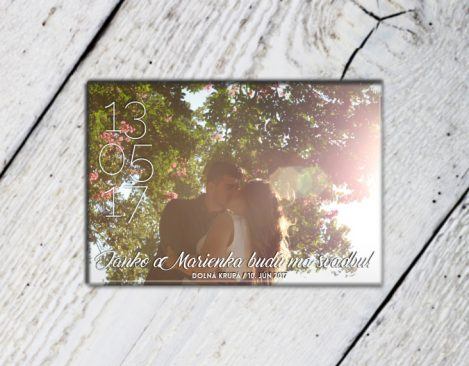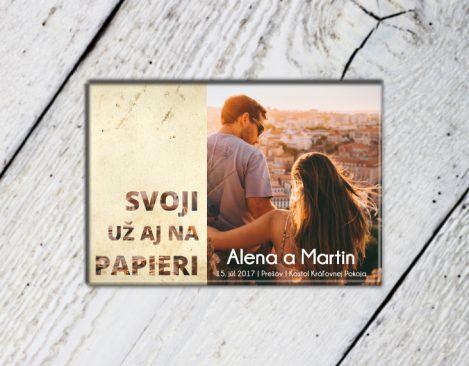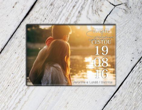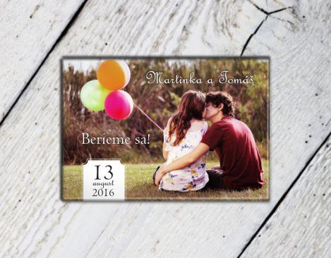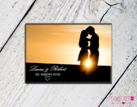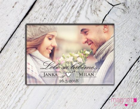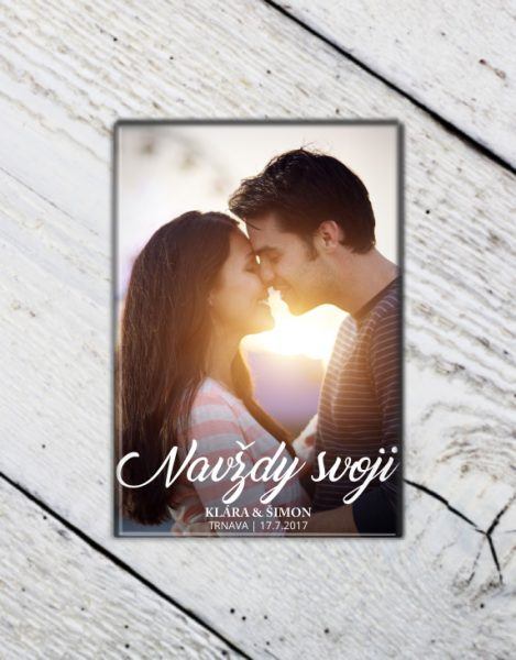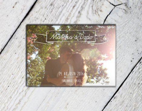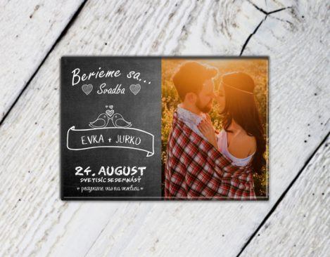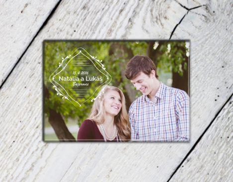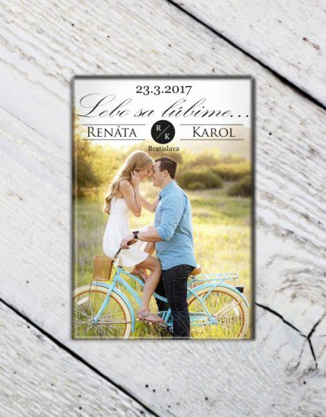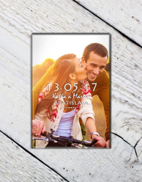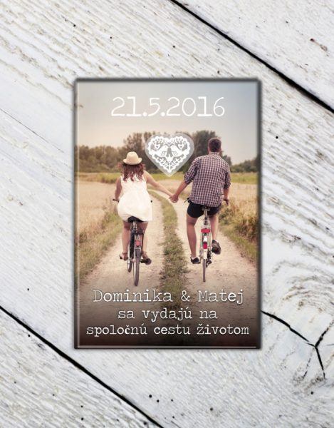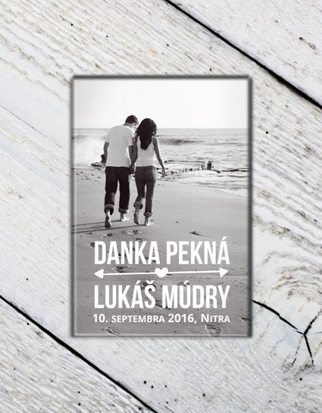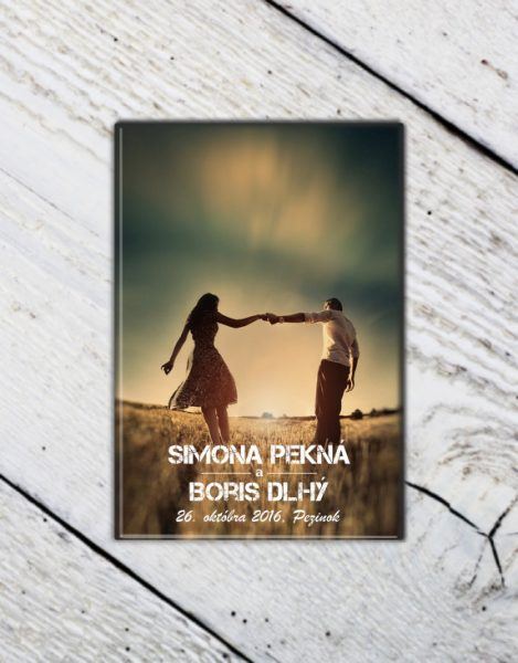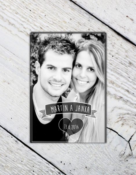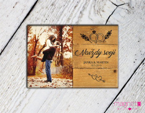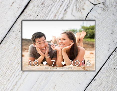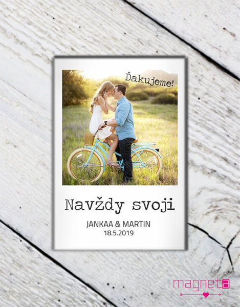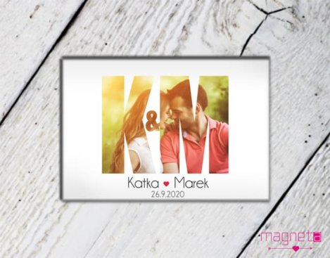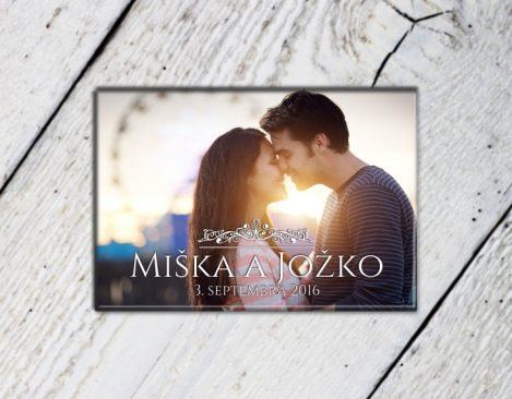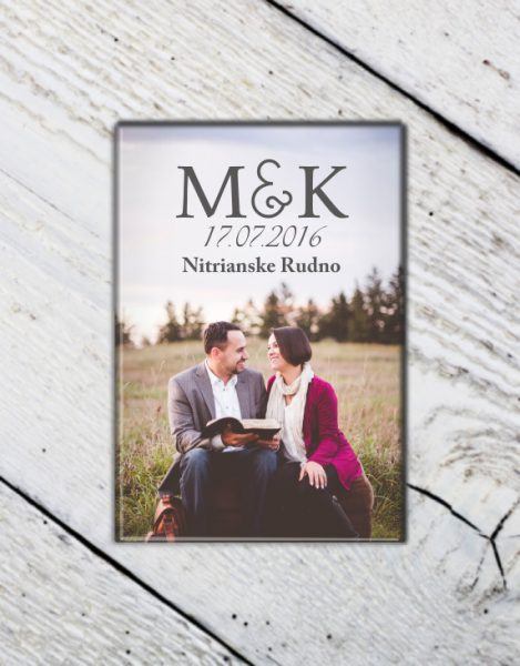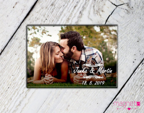 Svadobné magnetky na chladničku s vlastnou fotkou. Ponúkame vám na výber z množstva predpripravených grafických vzhľadov. Stačí vložiť vlastnú fotografiu, napísať mená nevesty a ženícha, prepísať dátum. A magnetky z vašej fotky môžeme začať vyrábať.