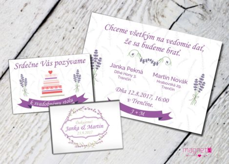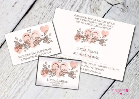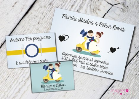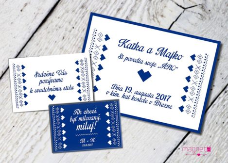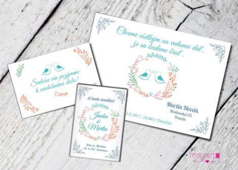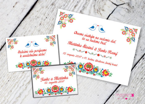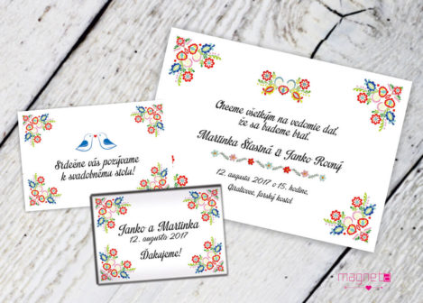 K magnetkám vám vieme vyrobiť aj ladiace svadobné oznámenia s fotkou, folklórne oznámenia, alebo grafickým vzorom a pozvánky na hostinu v rovnakom dizajne (rozmer A7, 300 g papier Slik – natieraný). 🙂